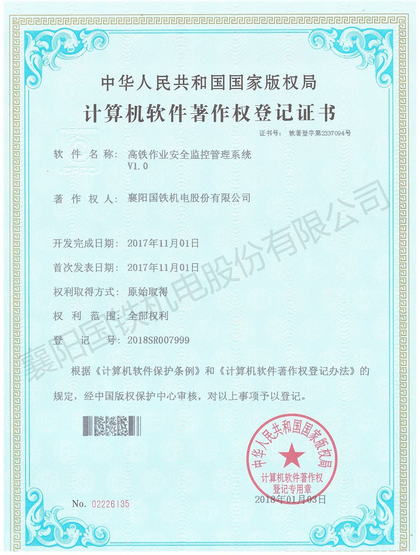 高鐵作業安全監控管理系統(軟件著作權證書)